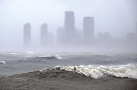 这是10月5日拍摄的在强风雨中的海口市区。受今年第21号台风“麦德姆”影响,海南岛北半部地区出现强风雨天气。