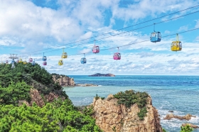 10月7日,在山东省荣成市成山头风景区,游客乘坐缆车观景。国庆中秋假期进入尾声,各地游客游兴不减,赏美景,品美食,乐享假期。图/新华社