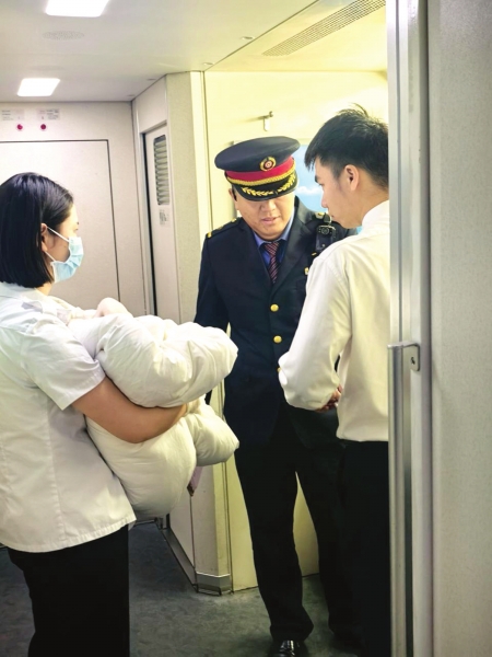 “D939次列车14号车厢有一名待产孕妇突然临产,无家属陪同,请立即协助救援!”10月13日凌晨4时许,当城市仍在沉睡时,一道急促的调度指令打破了长沙火车南站的宁静——本应在值班室轮休或短暂休整的客运车间值班干部覃君及值班员张靖、黄峰等工作人员,接到通知后瞬间绷紧神经,一场与时间赛跑的紧急救援随即展开。