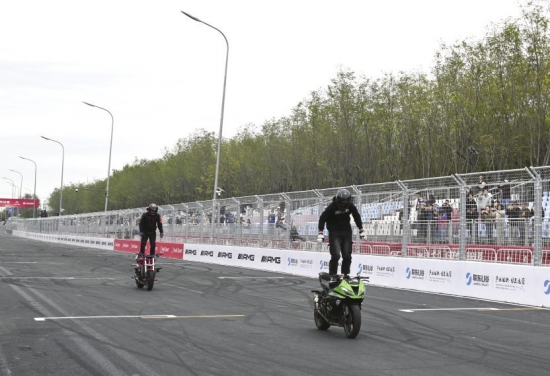 10月17日,特技车手在赛道进行特技表演。当日,GT世界挑战赛北京亦庄站进行赛前训练,比赛将于18日至19日在北京亦庄通明湖区域以街道赛形式进行。图/新华社