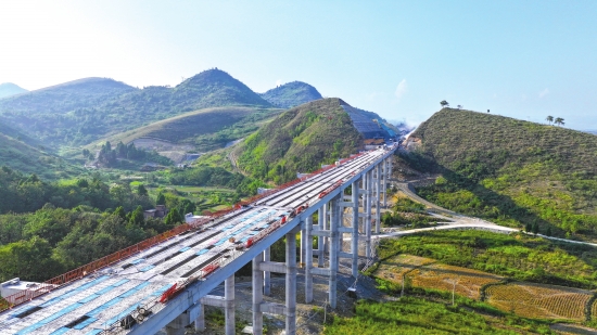 10月17日,航拍正在建设的桂(东)新(田)高速永州市新田县龙泉街道石甑源村路段,高速公路犹如一条“巨龙”穿梭在秀美的甑子岭、白米寨之间,与田园、村庄、青山相映成景,壮美如画。 桂新高速公路是湖南省“十四五”重点项目,东段起于郴州市桂东县寨前镇,路线往西经永州市新田县城南侧止于宁远县清水桥镇,连接二广高速。沿途绿水青山,风光秀丽,古民居众多。桂新高速建成后将结束新田县不通高速的历史,极大地改善湘南山区交通状况,有力推动沿线乡村旅游和农业产业的高质量发展。 图/通讯员刘贵雄陈祉凝