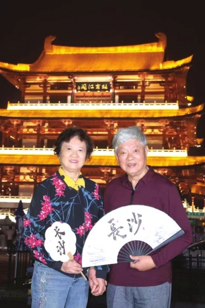 本报长沙讯 傍晚的湘江畔,杜甫江阁灯火初上,与波光粼粼的江水交相辉映。熙攘的游客中,一位精神矍铄的老人与身旁笑容温婉的夫人格外引人注目——他们正是87岁的导弹专家方群与夫人张琍蕾。15日晚,在摄影师王剑的镜头下,这对夫妇的身影与长沙夜景融为一体。