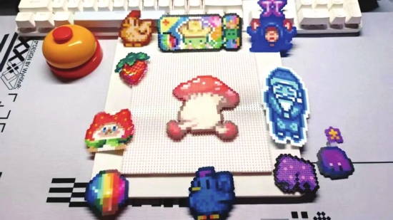 重复摆放豆子的过程,让人放空大脑专注当下;亲手拼的图案在烫压后完美成型,成就感与满足感更是直接拉满;最终的成品摆放在一起,拍张照发到社交平台,立刻就能吸引到同好的点赞与讨论。