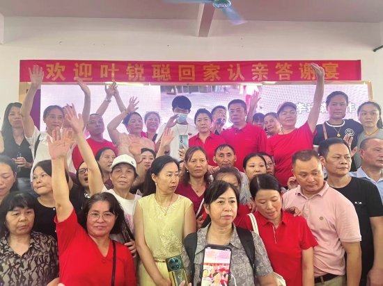 “我儿子叶锐聪回来了!”10月19日感谢宴现场,被寻亲家长称为“大喇叭”的寻子母亲邓惠东多次泣不成声,与丈夫、女儿、两个儿子紧紧相拥。