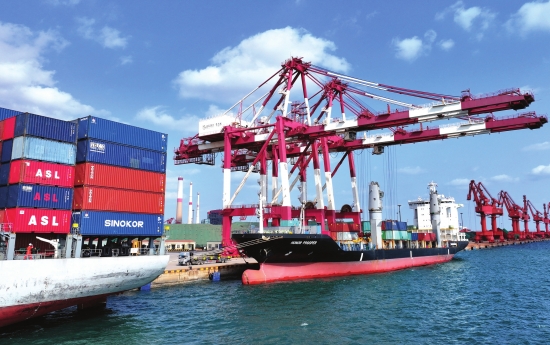 近日,山东青岛,直达韩国仁川港的“泛奥升奥普轮”(右)在青岛港前湾港区装卸集装箱。