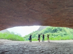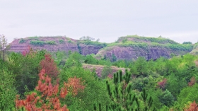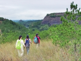 没多久,我们登至山顶。由于四周山头都差不多高,我们没法“居高临下”,望不见太远的地方。我们犹如置身于一片丹霞地貌的海洋中,入目所见尽是红色砂砾岩及山上并不茂盛的植物。此时此刻,我们深感自身渺小,而大自然则伟岸,天地更是浩瀚无垠。一些山峰下有巨大岩洞。洞穴对于人类有天然吸引力,可惜我们当天并无富余时间去探秘。远方有一高山,分外醒目,形似日本的富士山,我们怀疑它就是石牛寨景区那海拔五百多米的主峰。