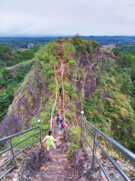 跨过田埂,就来到了席帽峰山脚下。席帽峰因外形酷似宋朝官员所戴的席帽而得名,又名艾仙坛。相传东汉时期,有葛艾两位仙人在此烧丹练药,普度众生。山脊线上植被稀少,狭窄山道两侧是陡峭的危崖,颇有行走在郴州高椅岭上的感觉。由于没安装护栏,我们放慢脚步,小心翼翼地沿着台阶前行。
