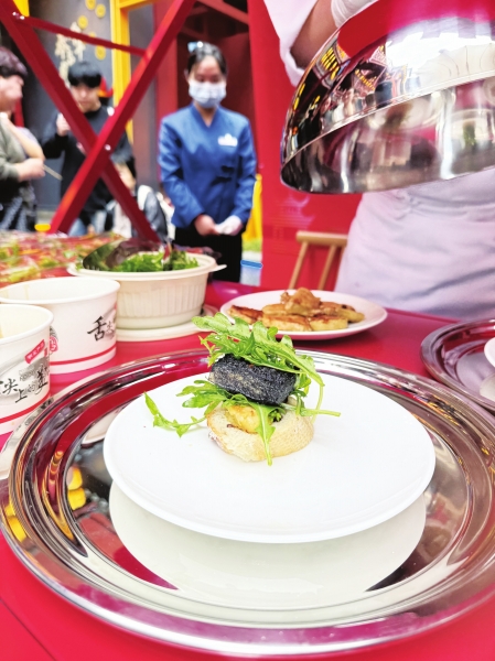 在“美食有‘湘法’中法美食体验周”现场,“臭豆腐鹅肝汉堡”成为打卡热门。图/记者王丽姣