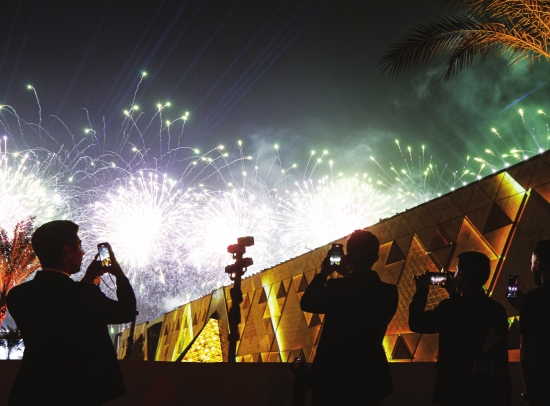 当地时间11月1日,人们在埃及吉萨举行的开馆仪式上拍摄烟花和灯光秀表演。