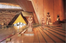 大埃及博物馆占地约50万平方米,馆藏文物超过10万件,首次完整集中展示古埃及法老图坦卡蒙的5992件随葬品,此外还展出修复后的胡夫太阳船、古埃及法老拉美西斯二世巨像等文物。