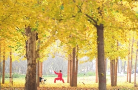 11月4日,市民在石家庄市的河北经贸大学的银杏林下晨练。