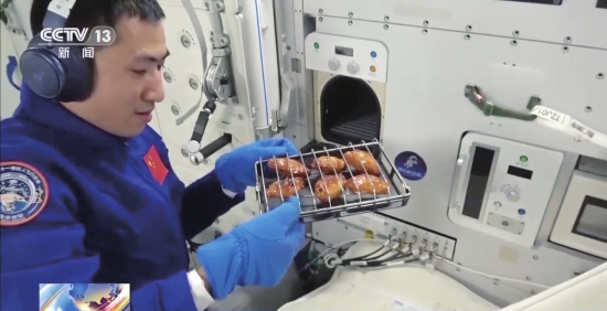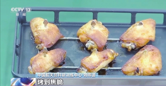 记者从空间站下行的视频资料看到,航天员从包装袋里取出腌制好的鸡翅,在签架上进行固定后放入热风烘烤机内,加热28分钟,一盘滋滋冒油的宇宙级奥尔良烤鸡翅就制作出来了。神二十航天员王杰和神二十一航天员武飞两个内蒙古人,还联手烤制了一盘热气腾腾的黑椒牛排,让神二十乘组指令长陈冬一饱口福。