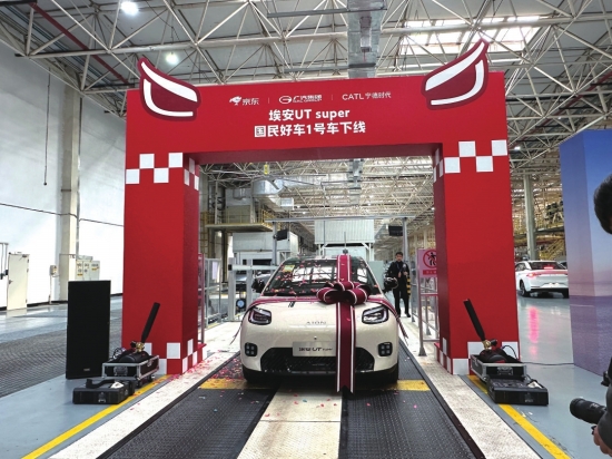 11月5日上午,由零售、制造与能源三大领域的代表企业京东、广汽集团、宁德时代联合推出的“国民好车”——埃安UTsuper1号车正式迎来下线。这也是该款新车首次对外完整展示外观设计、制造工艺、电池技术及换电过程等细节。
