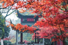 有了那次教训,我便学乖了。硬是等到十二月中旬,天气明显转凉,才又挑了个有太阳的周末上山。从东方红广场信步走进去,穿过麓山南门,走到清风峡一带。刚过拐角,没防备的,那片念叨了好久的红色,一下子占满了眼帘。