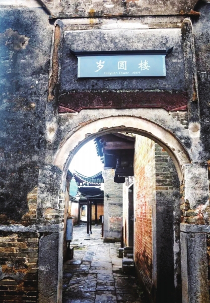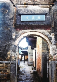 出巷道就绕到岁圆楼古建筑群的前坪,一方半月形池塘,几块字迹有些模糊的旗杆石,也诉说着曾经这里出现过大官彰显功勋而热闹繁华的故事。顺着池塘前行,路旁就是“状元楼”,其实就是当时的私塾,培养子弟的学堂,房间很多,装修设计简单,也就是祖先重读书、寒窗学子出人才的体现。