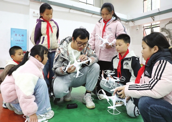 11月11日,湘西州保靖县毛沟镇芙蓉学校的老师指导学生操控无人机。 近年来,该校成立无人机科创小组,以“智控飞行”为主题,研发校本教材,通过理论与实践相结合的方式,培养学生的创新思维和动手能力。 图/视觉中国