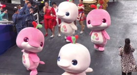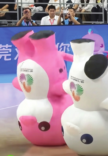 “喜洋洋”“乐融融”的形象灵感来源是“中华白海豚”,一白一粉的配色又像极了广东经典菜品“白切鸡”和“豉油鸡“,于是网友们根据“活力大湾区,魅力新广州”的口号,给它俩起了“大湾鸡”的昵称。有现场观众拍到视频,皮套下的都是十多岁的武校学生,网友纷纷为这个创意点赞:“想出让小孩哥扮演吉祥物的人简直是个天才!”