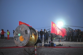 11月14日,载着神舟二十号航天员乘组的神舟二十一号载人飞船返回舱在东风着陆场成功着陆。组图/新华社