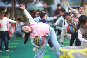 14日,怀化市通道侗族自治县幼儿园,孩子们正在课间进行体能锻炼。文、图/通讯员李尚引何梦怡