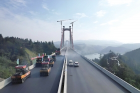 本报长沙讯 11月16日凌晨4时许,随着最后一车高韧性沥青混凝土摊铺、碾压结束,张官高速关键控制性工程——洞庭溪沅水特大桥沥青桥面摊铺施工圆满收官。这标志着这座湖南省在建最大悬索桥主体工程建设全面告捷,建成通车进入倒计时。