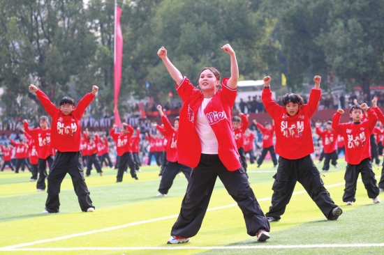 近日,永州市青少年运动会暨永州市第五届中小学生运动会在新田二中举行,开幕式上来自该县各中小学的武术操、瑶族长鼓舞、啦啦操、街舞等特色大课间项目进行了展演。近年来,新田县将武术、街舞、韵律操等项目纳入大课间活动,打造丰富多彩的特色大课间,让学生们享受运动的乐趣,增强体质、健康成长。图为教师带学生进行街舞表演。 图/通讯员刘贵雄