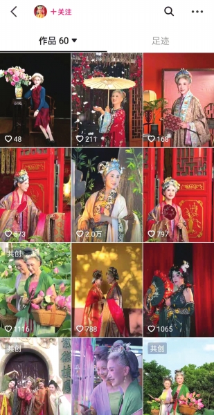 每条视频都是“小工程”:提前踩点、设计脚本、搭配妆造、正式拍摄,常常需要一整天的时间,不过曹萍觉得体力尚能接受。“这是唐装,这是汉服,这是在长沙太平老街拍的,前段时间有网友觉得我适合(扮)黎山老母,出了一期妆造。”曹萍细数每个视频。