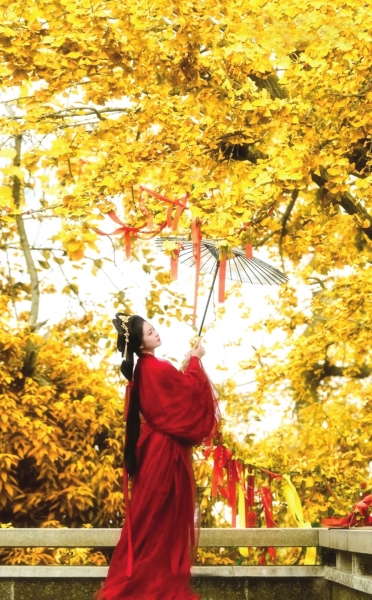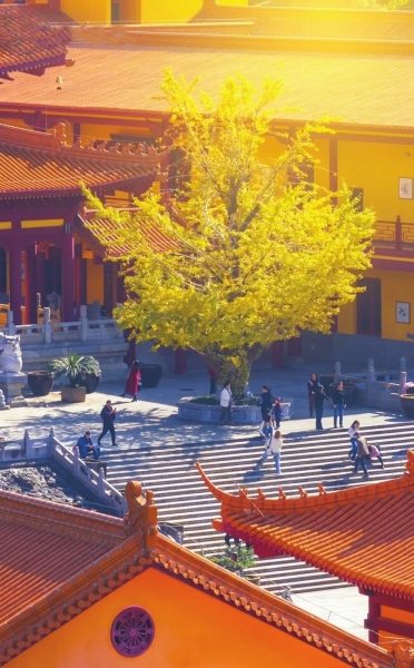 寺庙外的黄墙配银杏,古色古香的氛围感直接拉满。
