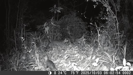 小灵猫主要栖息于热带、亚热带低海拔森林环境,性格机敏胆小,为独居夜行性物种。此次监测捕捉到的清晰影像显示,小灵猫行动矫健、状态健康,不仅在林下穿梭时展现出灵动身姿,其夜间明亮的眼部反光更凸显了物种的原生习性。这些记录为研究小灵猫的种群分布、栖息偏好及繁殖规律提供了极具价值的第一手资料,也印证了新晃森林生态系统食物链的完整性与稳定性。