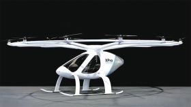 除了首秀的VoloCity飞行器,在室内展区,一款大型eVTOL飞行器也吸引了观众的目光。如果把之前2~3人乘坐的eVTOL飞行器比作轿车,那这款飞行器就相当于是商务车。