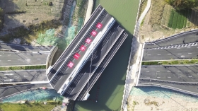 近日,位于上海市浦东新区万祥镇的平转式开启桥“三灶港桥”建成亮相。该桥创新采用“常开常闭”智能运维模式,兼顾桥面通行和游船通航,通行后将便利周边居民出行,带动当地文旅发展。图/新华社