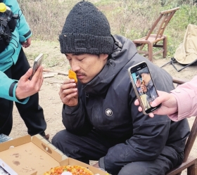 退赛后最想干的一件事是什么?“文车车”告诉记者:“吃肉!”在工作人员的帐篷里,有剩下的比萨和炸虾外卖。工作人员热情递给他,他拿起炸虾,先放在鼻子前深深吸气,随后才放进嘴里:“这是什么人间美味,太香了,我要哭了。”还有已经冷掉的腊肉,“文车车”塞进嘴里,眼睛直眯成一条缝:“越嚼越香。”