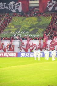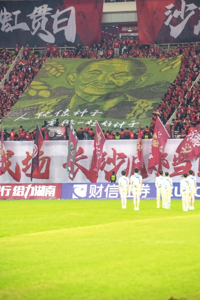 11月14日晚,湘超长沙队主场迎战益阳队。在暖场阶段,贺龙体育场的长沙球迷助威团看台,这幅巨大的TIFO徐徐展开。