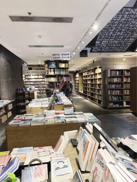 厅与厅之间摆了皮长凳、编织草垫等物件供读者小憩。最后一个厅兼有讲学功能,厅中有数十个读者在听讲座。从此厅往东门出,我眼前一亮,原来是一个下临芙蓉路的长廊式茶餐厅,可提供中西菜品和茶饮等,餐厅一直向南延伸又西接第二个营业厅。长廊设面对面卡座,中间有桌子,方便读写、吃饭、充电,人若疲倦了,还可以躺在长软椅上闭目养神。