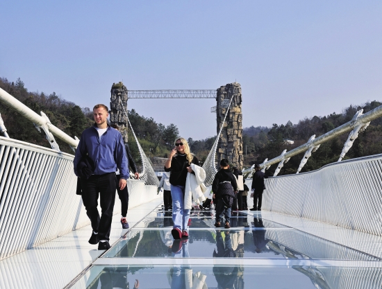 12月7日,外国游客在湖南张家界大峡谷风景区体验高空玻璃桥。图/视觉中国