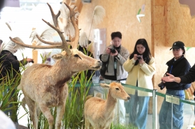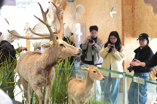 12月9日,岳阳,嘉宾参观麋鹿标本。当日,“江湖四宝·湘北画卷”媒体生态探秘采风行活动的嘉宾来到岳阳洞庭湖麋鹿苑,这里生活着一群自然野化麋鹿。东洞庭湖麋鹿与鸟类救助避难中心2016年成立,近十年累计救助麋鹿80多头。