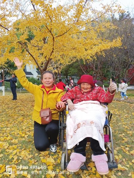 “我经常带她去芙蓉广场玩,我告诉她这里是芙蓉广场,说了几次她就记得了。”湖南烈士公园、橘子洲、湖南省植物园……李葵良都带着母亲去过。“今年母亲手术康复后,为了让她开心,我和我弟弟就推她到湖南省植物园。有愉快的心情,有利于健康。”