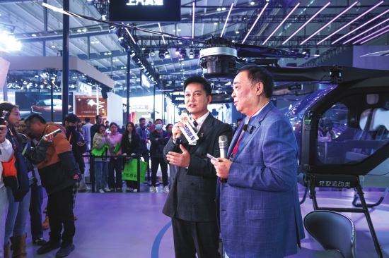 汇天航空航天公司副总裁李锐和湖南永通汽车集团董事长蒋宗平接受媒体采访。
