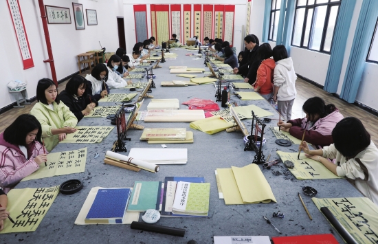 12月11日,永州市道县敦颐高级中学书法社团的学生在练习书法。近年来,永州市道县引导各中小学因地制宜,开发内容丰富、形式多样的社团活动课程,满足学生的个性化、差异化需求,促进学生全面发展、健康快乐成长。