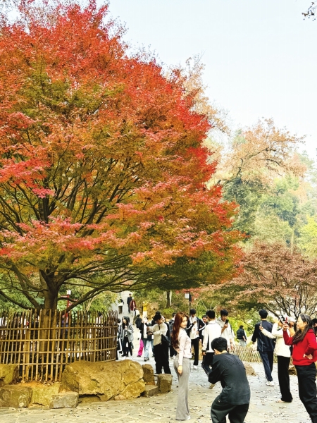 在岳麓山标志性景点爱晚亭旁,一株红枫正值盛期,绛红色的叶片与古亭飞檐相映成趣,成为游客争相拍摄的焦点。