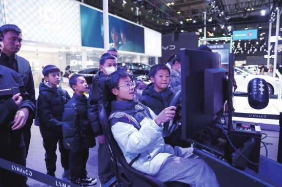12月14日,长沙国际车展现场小朋友排队体验模拟赛车。图/记者杨旭