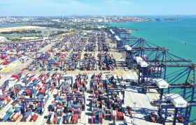 日前,在海南岛西北部的洋浦港,小铲滩码头数台高大的岸桥正在对泊位上的大型集装箱货轮进行装卸作业,港内集装箱运输车正沿着既定路线穿梭往返。