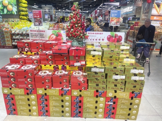 在盒马鲜生喜盈门店,记者看到,车厘子陈列区主要以礼盒装为主,并且推出了限时活动,2J规格车厘子2.5kg礼盒优惠后价格为189元,3J规格车厘子2.5kg礼盒为229元。盒马喜盈门店店长刘宸熙介绍,截至目前,车厘子12月环比销售涨幅达到500%,随着海运车厘子的持续到港,价格预计还会有下行空间。