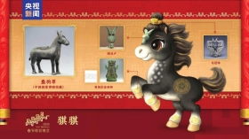 “骐骐”的设计灵感源自西周盠驹尊,配色取自“骐”字本意——青黑色的马,气质庄重而典雅。“骐骐”头戴当卢,高束发髻、彬彬有礼,尽显朝气蓬勃、心怀远志的昂扬奋进之姿。