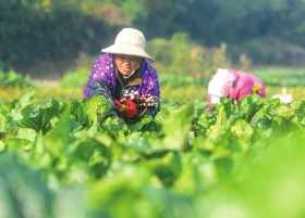 12月19日,永州市道县营江街道芒头寨村蔬菜基地,农民在采摘蔬菜。时下,当地农民忙着采摘蔬菜,全力保障“菜篮子”供应充足。近年来,道县大力发展绿色蔬菜生产,源源不断销往粤港澳大湾区。 图/通讯员蒋克青