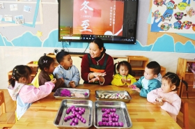 19日,永州市江永县中心幼儿园,小朋友在老师的指导下做汤圆。冬至节气即将来临,该幼儿园开展“我们的冬至”节气民俗体验活动,小朋友们包饺子、做汤圆、知民俗,体验传统文化。文、图/通讯员田如瑞