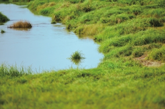 走入新墙河的河口区域,要经过广袤的草滩。草滩中有小径,是附近村庄的牛群踩出来的。从下车点到河床中一片面积较大的沙坝、心滩要走大约30分钟。河口的广袤让人惊叹,地面稍有起伏,视野极佳,一直延伸到远处的湖面,那里是河床的尽头。