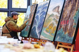 福建武夷的一名岩彩画师在创作岩彩画。位于福建北部的武夷山是世界文化与自然双遗产地。其独特的丹霞地貌不仅孕育了独具岩骨花香的武夷岩茶,多彩的岩土也成为绘画的天然颜料库,造就了独具特色的武夷岩彩画。武夷岩彩画从传统中走来,融入现代艺术元素和技法,正逐渐成为武夷山地方文化特色。图/新华社