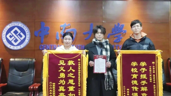 本报综合 中南大学微信公众号12月23日消息,近日,该校自动化学院2025级本科生王庚垚与湘雅医学院毕业生张晴,因一次挺身而出的救助行动,收到了两面锦旗和一封真挚的感谢信。信中写道:“两位同学在贵校的教育下,乐于助人,在紧急情况下挺身而出,展现了大学生在新时代的高尚道德情操,用实际行动弘扬了社会正能量,值得每一位学生学习。”