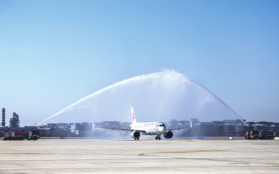 12月26日,一架飞抵的客机在嘉兴南湖机场停机坪过“水门”。当天嘉兴南湖机场正式投运。据悉,嘉兴南湖机场定位为“客货并举、以货为主”,飞行区等级4E级。图/新华社