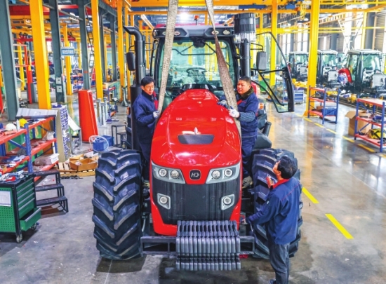 1月5日,在江苏某公司,工人在大马力全动力换挡智能拖拉机生产线上作业。新年伊始,各地企业铆足干劲赶订单、忙生产,力争首季“开门红”。图/新华社